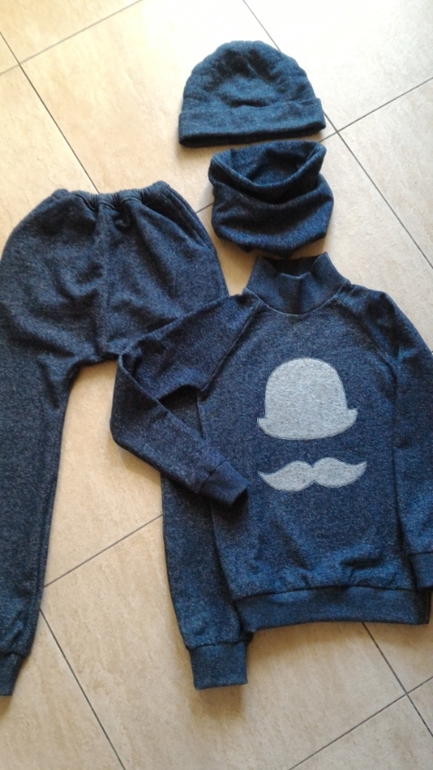 Новичкам. Мои первые работыФото под катом. Выкройку свитшотов брала из ОТТО (весна 1/2016), брюк - Бурда 12/2011. Ткань синего костюма - футер трехнитка, петля. Аппликацию вырезала из своего старого серого снуда, проклеивала паутинкой и с изнанки флизелином, затем пришивала. Манжеты из кашкорсе. Зеленый костюм из футера двухнитки, манжеты - рибана, аппликация - ТТшка. Из остатков ткани сшила двойные шапочки и снуды.