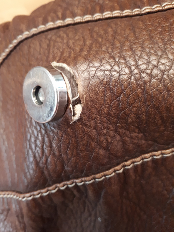 Я бы склеила кожу(место разрыва),а на задней стороне проложила что-то жесткое на этом участке,где кнопка и опять же проклеила)))