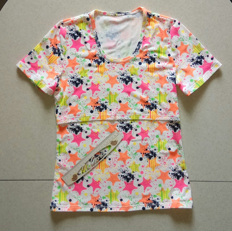 Идею подсмотрела у футболки "I love mom". Там растягивается, но не критично и верх держит. Мне именно такой секрет больше нравится. Если молоко протечет при кормлении, то только на внутреннюю майку, сверху все будет чисто и без пятен))