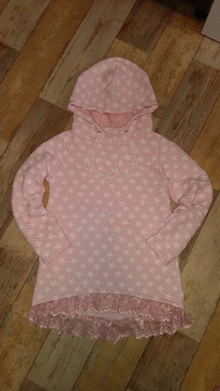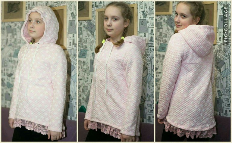Когда я только начала шить из трикотажа, то заказала на пробу кусочек 0,6 метра капитония. Простой свитшот дочь не возжелала :) для чего-то поинтереснее кусочек оказался маловат, заказала еще такой же кусочек, но "мудрить" все равно пришлось :) сварганила вот такую "недотунику-худи" :) выкройку опять же сооружала сама. В первом варианте слишком углубила горловину спереди, пришлось пороть и делать новую вставку (уже из самых остатков). В капюшоне подкладка из гипюра, по низу отделка из края этого гипюра.