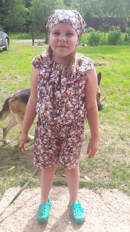 Смотрела я на ваши работы,смотрела и полезла в сундук)Нашла пёстренькую ткань из СССР,сшила комбез и косынку на резинке.Дочка на даче с племяшкой,т.ч. срочно нужен второй,"чтоб, как близняшки")