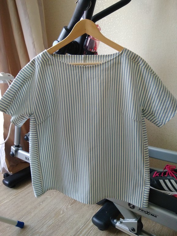 Сшила. По спинке пришлось ушить на 3см из-за того, что топорщилась горловина. И длину обрезала. Раскроила не так, как надо, потому что хотела вертикальную полоску. Вот что получилось в итоге))