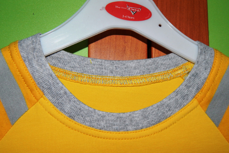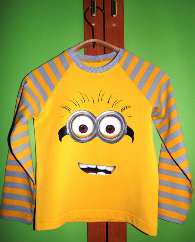 Желтый - из кулирки с лайкрой. Миньон - термотрансфер, тоже "чайнатауновский". Шила по быстрому, без излишеств. На горловинках везде рибана, с киперкой не стала заморачиваться (надо было быстрее сшить как можно больше - на работе будет не до этого), поэтому отстрочила просто плоским швом - что бы не отгибался шов.