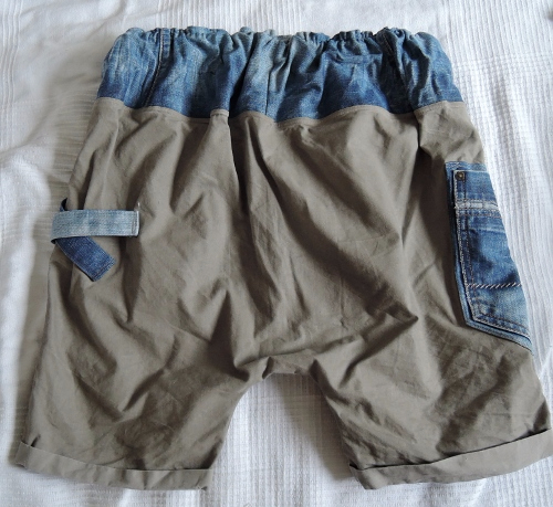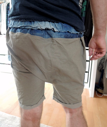 В итоге получились вот такие шорты. Не удивляйтесь, в Берлине такое странное можно носить;))) А моему мужу очень нравится нестандартный крой (есть пару вещичек от TheLees). Эти шорты правда только пробный вариант, в город в таком не выпущу%)