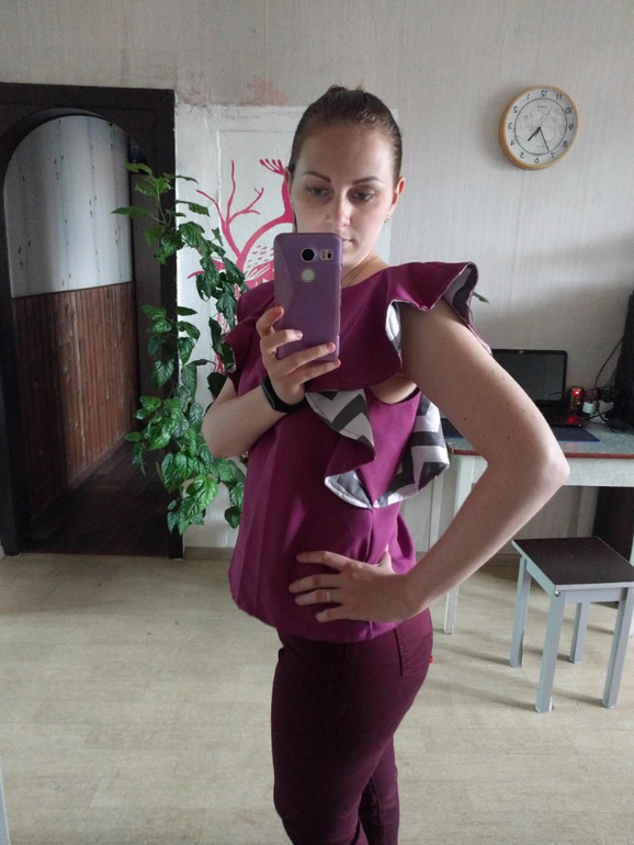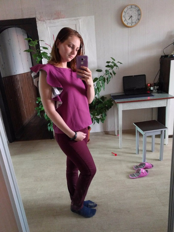 Шьем взрослымВот как всегда!(Захотелось в 100 раз себе что-нибудь сшить.Шила-шила целый день,одела и теперь не пойму,носибельная блузка или нет.Вроде и нормально,а вроде что-то смущает(Или это моя привычка с лосинах да футболкам покоя мне не даёт.Что скажите?Жить ей или пусть в шкафу валяется?Даже отклаживать пока не стала..