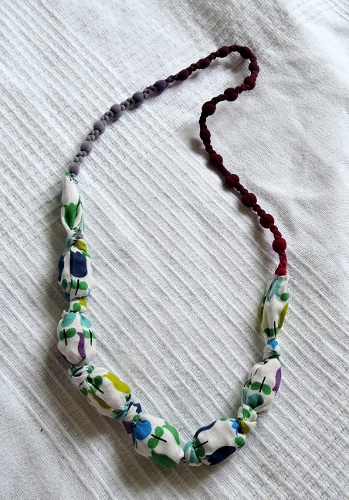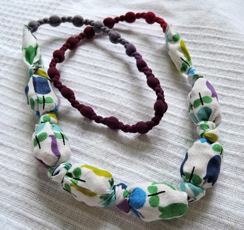 Это что-то вроде слингобус, оставался малюсенький кусочек прекрасного плотного хлопка с тюльпанами, сшила в трубу, наполнила вишневыми косточками, завязала узелки и пришила к подходящей веревке.
