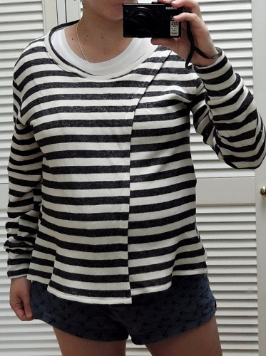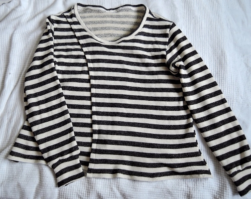 Ткань футер, с петельками на обратной стороне. Но именно этот очень "жидкий", такой не советую, пришлось с низом и горловиной помучаться(( Ну и за полоски пока мне рано браться;)