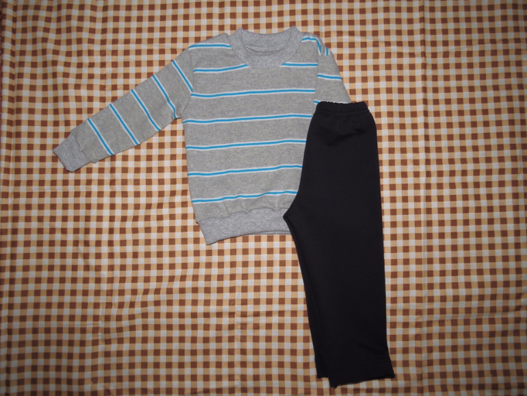 Это комплект тоже на р.74. Кофта из интерлока, манжеты, горловина из кашкорсе. Сшито по выкройке лонгслива отто 1-2013 мод.10, но модель узенькая, так что шила самый маленький 80. Штаны из футера 2х нитки петля с ПЭ, они темно-синие)) выкройка отто 6-2009 мод.35, они в журнале с р.92, но так как у меня выкройки только распечатанные и новые мне искать лень) то шила по ней, без припусков и без нижней манжеты))) подошло идеально)))))
