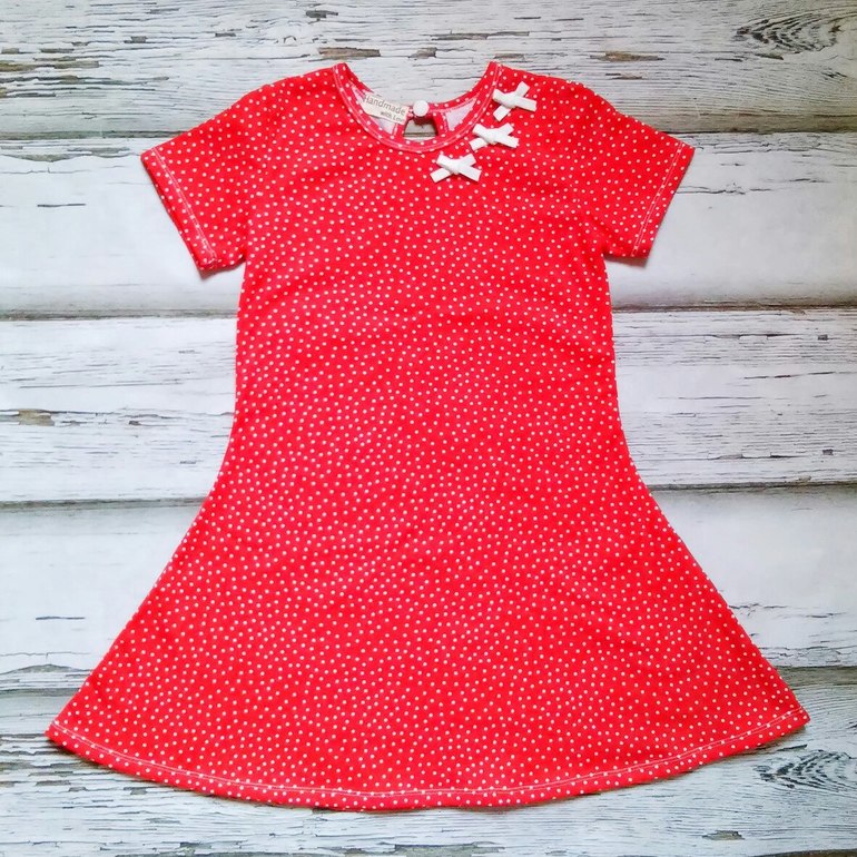 И платьишко в духе ретро, которое сшито по выкройке вышеуказанной футболки. На размер 116. Продолжила только юбку, вырезала капельку и всё. Кулирка хб. Застёгивается на кнопку.Всем тёплой осени