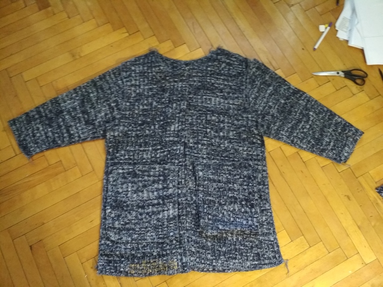 . Раскроила, оверложила швы и понимаю, что хочется подклад...уж больно дырявчато. Хотя ,когда на ощупь, не сказать,что большие дырки, но тк живём в Питере продувать будет знатно...и вот...