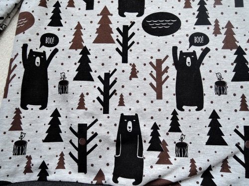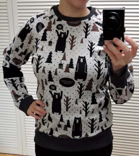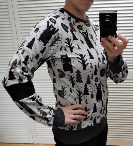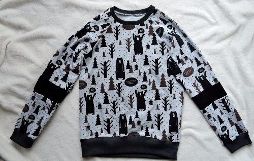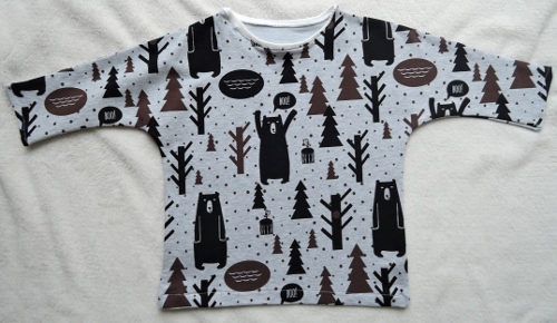 Из этой же прекрасной ткани с мишками свитшот моему малышу на весну. Выкройка оттобре 1/2015, самая легкая вещь в моей швейной карьере;) но и тут я конечно напортачила с горловиной(( никогда не буду больше полагаться на то, что дано в журналах, иначе ерунда получается.