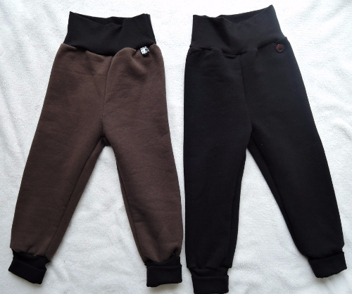 К свитшоту двое штанишек, тоже 74 размера, ткань футер с ворсом. Выкройка оттобре 1/2014. Там они двухсторонние, я взяла только один слой и пояс с манжетами по-своему сделала. Пуговичка и кусочек ленты для быстрого опознавания переда.