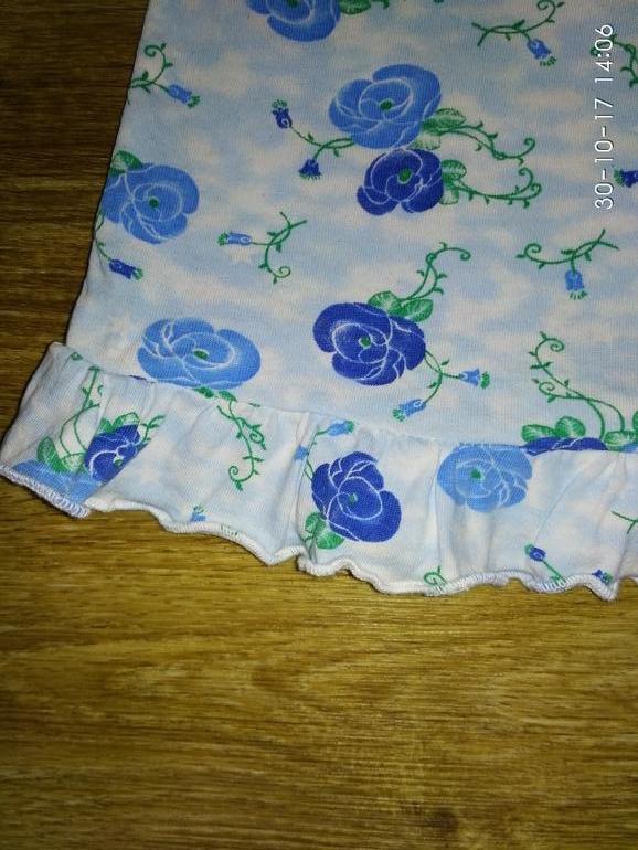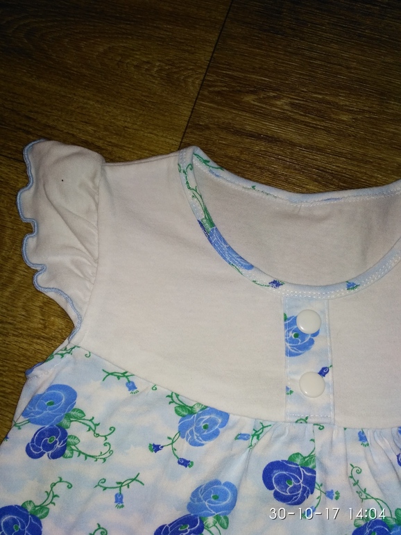 рукавчик белый, голубыми ниточками роликовый шов, планочка с пуговками, рюша внизу .