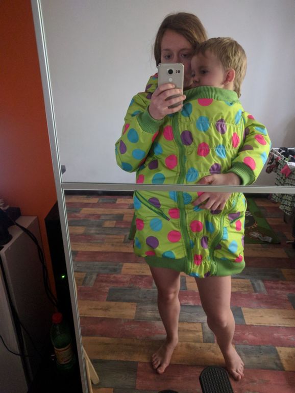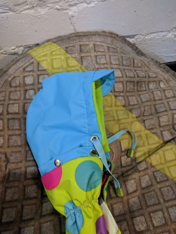 Потому что сегодня шел мокрый снег и летел пупсу на моську. Приходилось его рукой закрывать. Капюшон на кнопках, пока не мерили, но он на мелкую голову. Думаю по мере роста пупсенка просто сделаю новый капюшон и перестегну.
