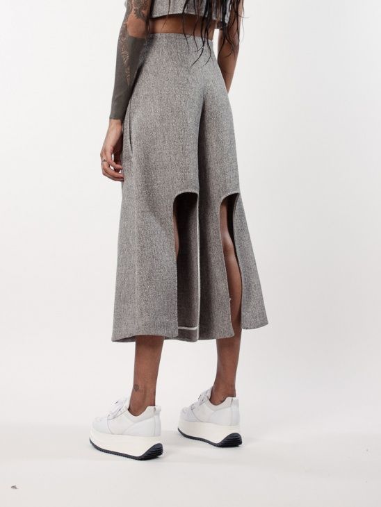 Ткань брюк должна быть не эластичной и достаточно плотной, для тяжести. А обтачку лучше тонкую брать. Чтоб ничего не фалдило, нужно после разметки разреза на брюках проложить осноровочную строчку, чтобы случайно не растянуть разрезы. Подобным образом горловину окантовывают. У Корфиати на её сайте, вроде бы был такой способ обработки.