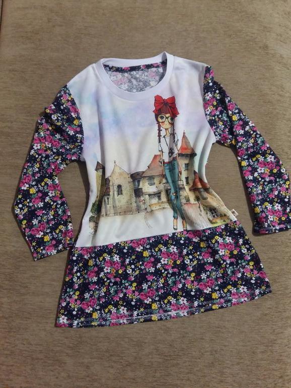 Туничка на 11 лет: выкройка футболки со шкатулки, р.42, рукав сделала три четверти, так как ткани было маловато, ткань кулирка 100 х/б, спереди тоже ткань для сублимации с печатью, спинка сборная из кусочков (длины не хватало), на отделке воротника рибана, шов закрыла тойже кулиркой. Но смотрится в целом помойму хорошо
