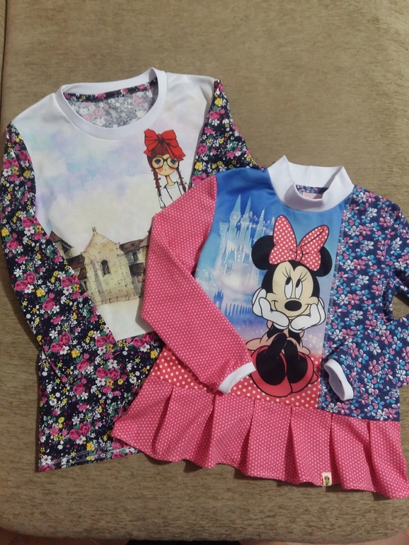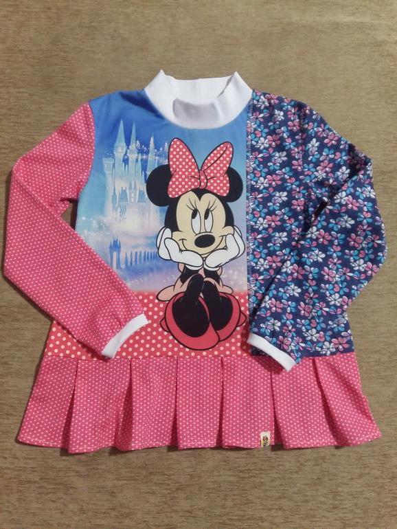 Туничка с Минни: за основу взята выкройка футболки с длинным рукавом со шкатулки (но мопойму такую видела у котого из отобре) на рост 128, ткань кулирка 100% х/б, минни напечатана на ткани для сублимации. Шилось из остатков прошлого комплекта, так что думаю подойдут сюда штанишки из такойже кулирки в горошек)) . Воротник и манжеты - рибана. Сначала разложила раскроенные кусочки на столе, а дабы вдруг что то поменять придется.