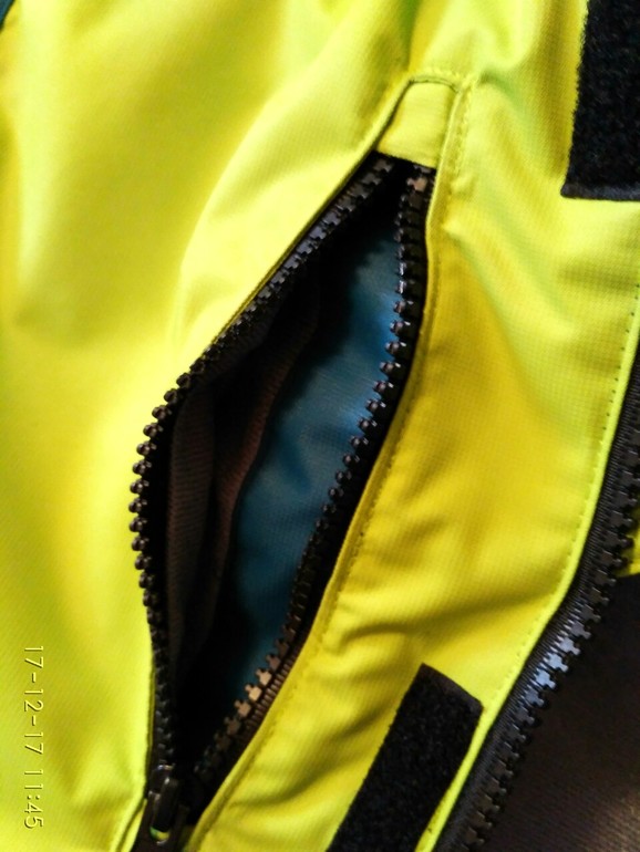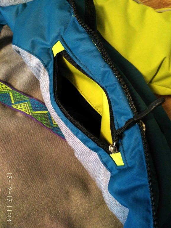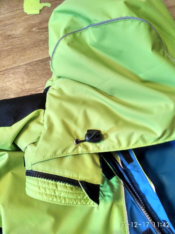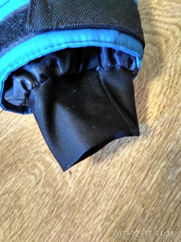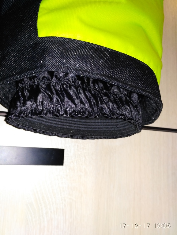 Рукава на манжете с утяжкой на липучку, хлястик из кордуры, внутри трикотажный манжет (опять же от старой куртки) и юбочка из подкладочной ткани, канты из светоотражайки делала сама, т.к. покупного не хватило.