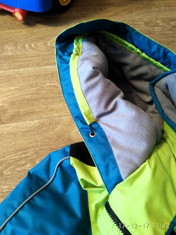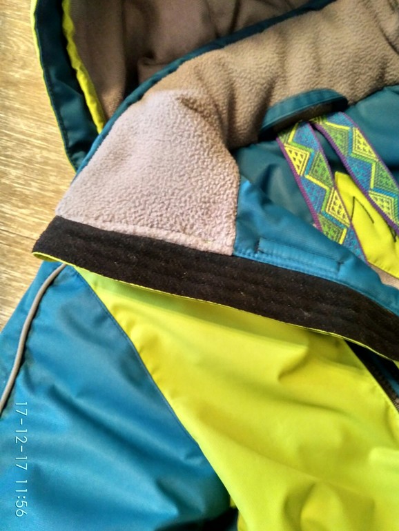 Капюшон с регулируемой утяжкой в кулиске внутри капюшона (очень удобная вещь), вшит в воротник, т.к. ушки с липучками сыну вечно мешаются, натирают, а прятать их в кармашки мне показалось бесполезным занятием. Поэтому так.