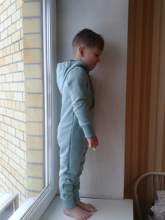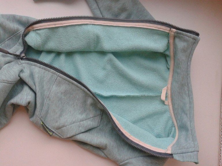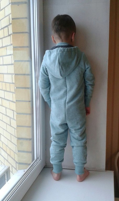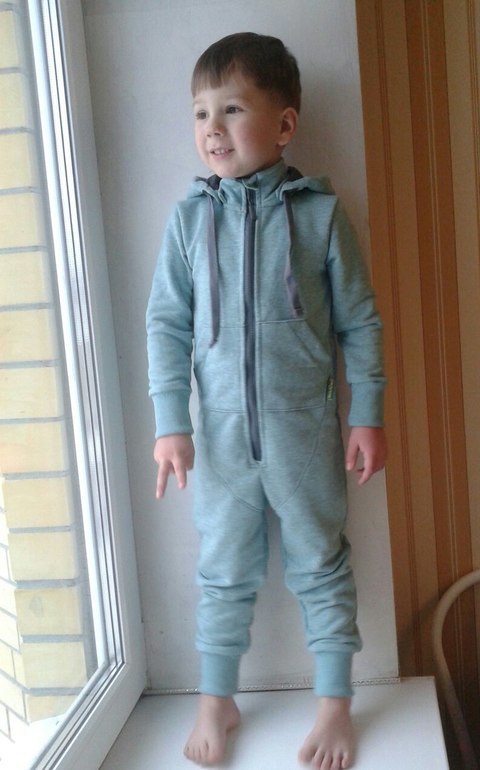 Слитник из диагонального футера 3х нитки, с изнанки петля. Шикарный цвет ментол меланж не перелся на фото. Выкройка самопостроена из штанов и кофты. Размер 110 на рост 110. Капюшон решили сделать съемный, можно носить сейчас как поддеву и летом как самостоятелью вещь с капюшоном. Примеряет сын, хозяин слитника 104см ростом.