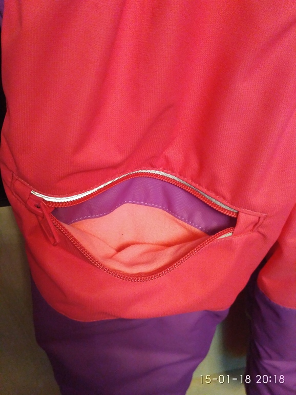 Два кармана на молнии в рамку с подзором из лиловой мембраны, внутри флис.