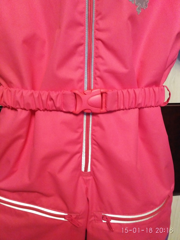 Очень хорошо держаться на сапожках, хотела ещё штрипки сделать, но и так ничего не задирается. На талии пояс с резинкой внутри, застегивается на фастекс. По бокам комбеза вручную пришила колечки для вдевания пояса.