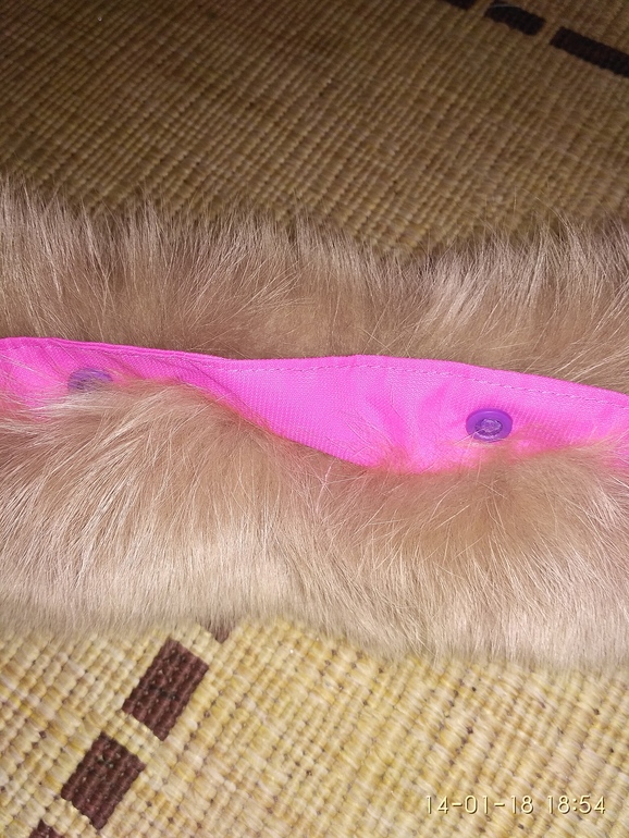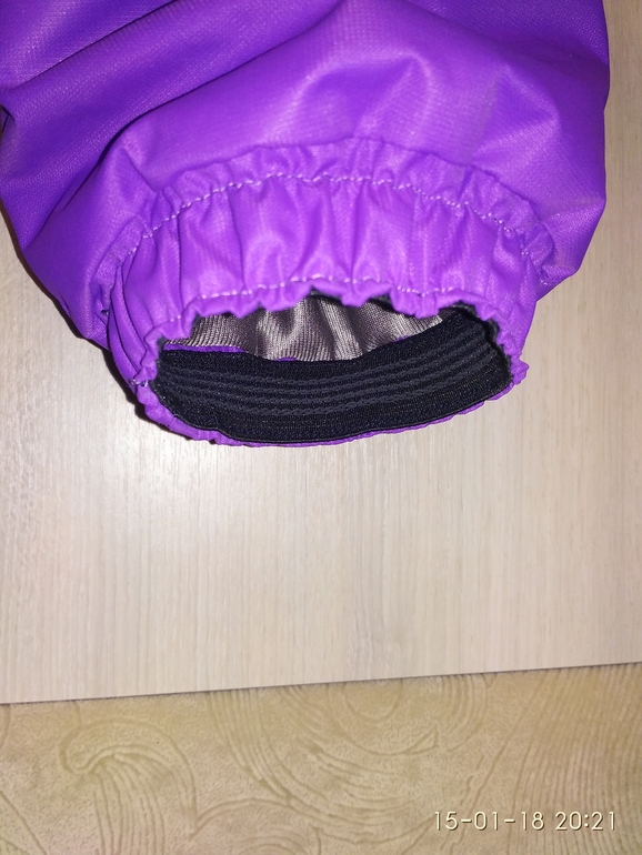 Сверху капюшона пришила планку, кнопки устанавливал муж, были только китайские пластиковые, но у него своя технология, уже проверенная - паяльником. И все работает долго и уверенно. Кнопки фиолетовые. Утяжка изнутри капюшона, резинка была только коралловая, но и она неплохо смотрится.