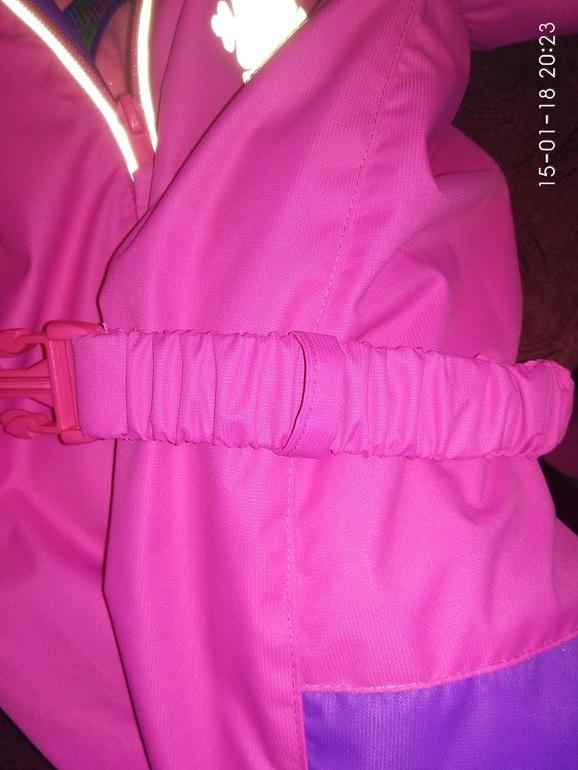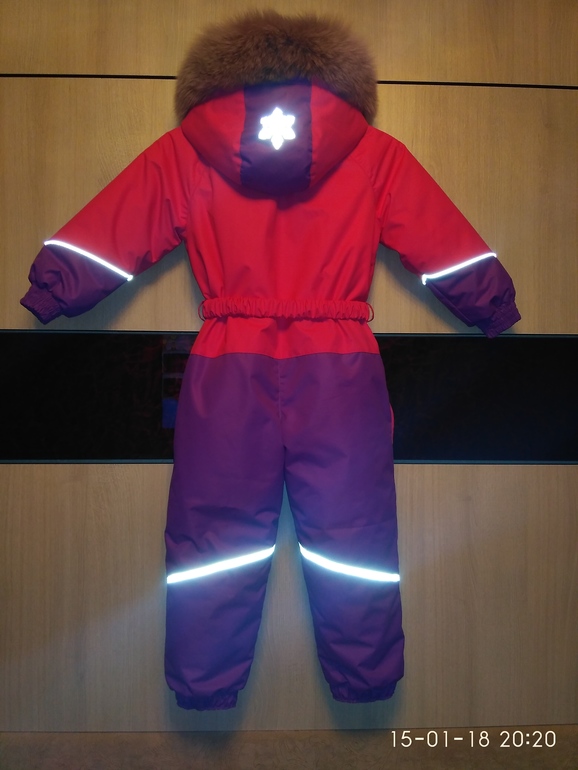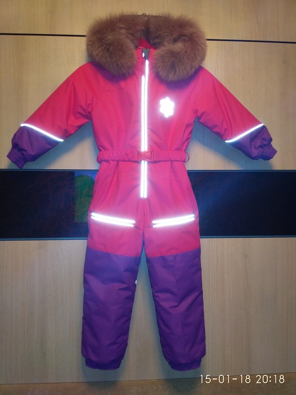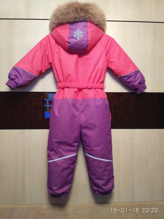 Выкройка: совмещала оттобре 2014-4-14 (верх) и 2005-4-22 (низ). Рост у дочери 95 см, верх взяла на 104, а низ на 86. Поднимала воротник, опускала пройму, тем самым расширяла рукав, удлиняла руки и ноги. Получилось и сейчас хорошо и на следующий год должно хватить. Ткань мембрана с армированной нитью ярко-розовая и лиловая.
