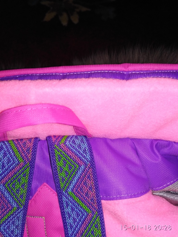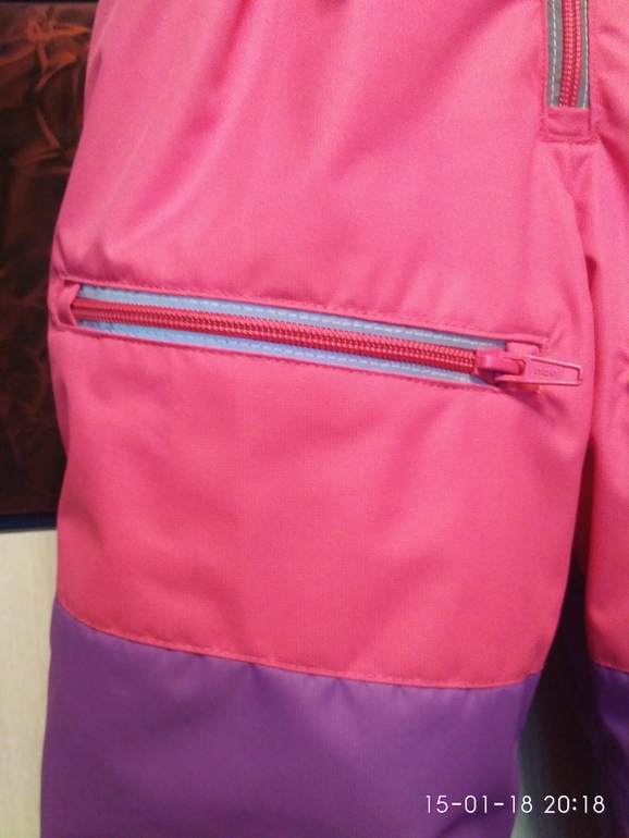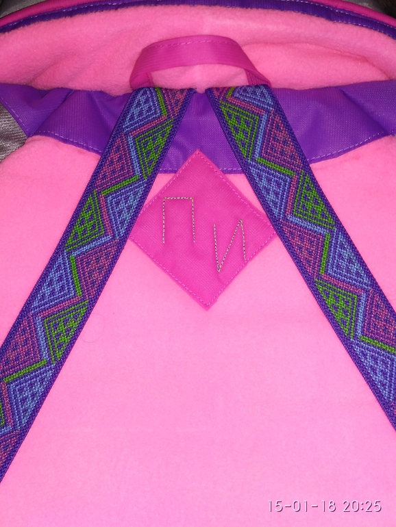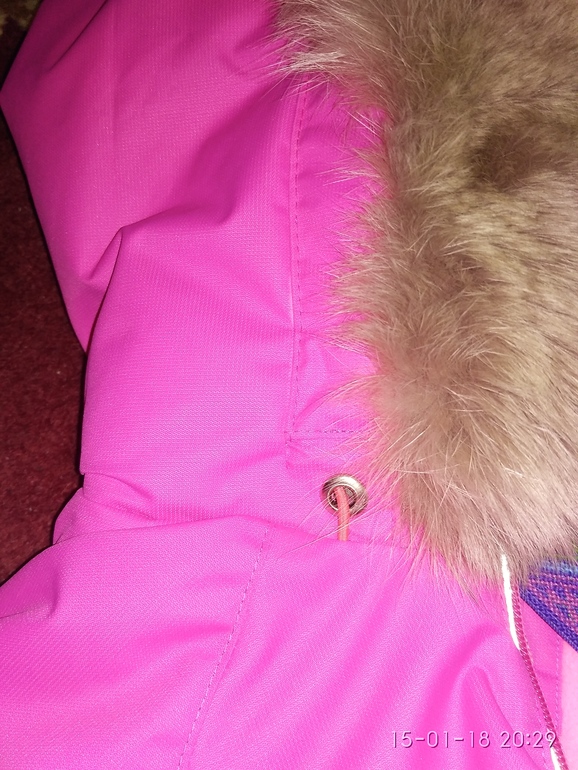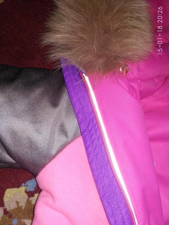 На подкладе каризма светло-серая гладкой стороной в рукавах и штанах (на всю длину не хватало, собирала из кусков), в капюшоне подкладочная серая ткань, чтоб по шапке хорошо скользил, а на спинке, полочке и воротнике флис светло-розовый неон, утеплитель альполюкс 150.