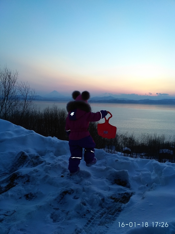 Воооооон там вдали, слева от дочки на другом берегу бухты виден "вулканчик", на самом деле он очень высокий, просто далеко находится.