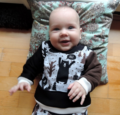 По детской выкройке сшилось еще 2 свитшота сыну. Штанишки к ним из Ottobre 1'2015. Свитшот из футера, штанишки из футера с начесом. На свитшоте пришила черную полоску по низу, по центру пристрочила кусочек, получились карманы. На штанах пуговицы и заплатки для быстрого определения переда.