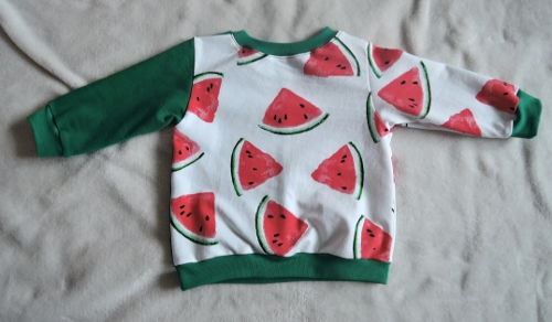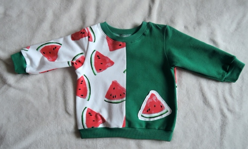 Ткань с рисунком трикотаж, коралловая - футер. Порезала свой свитшот, который как-то не носился, но так как цвет не особо мальчиковый, то дополнила тканью с рисунком и аппликацией трактора, по теме рисунка))