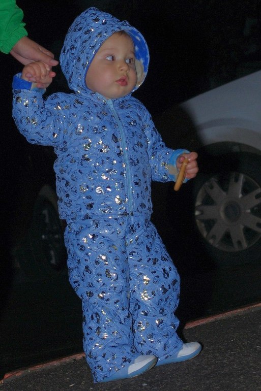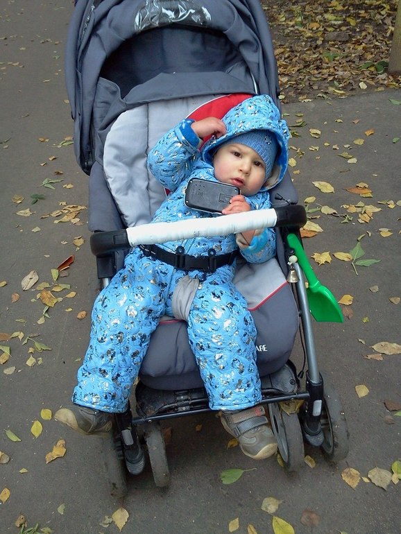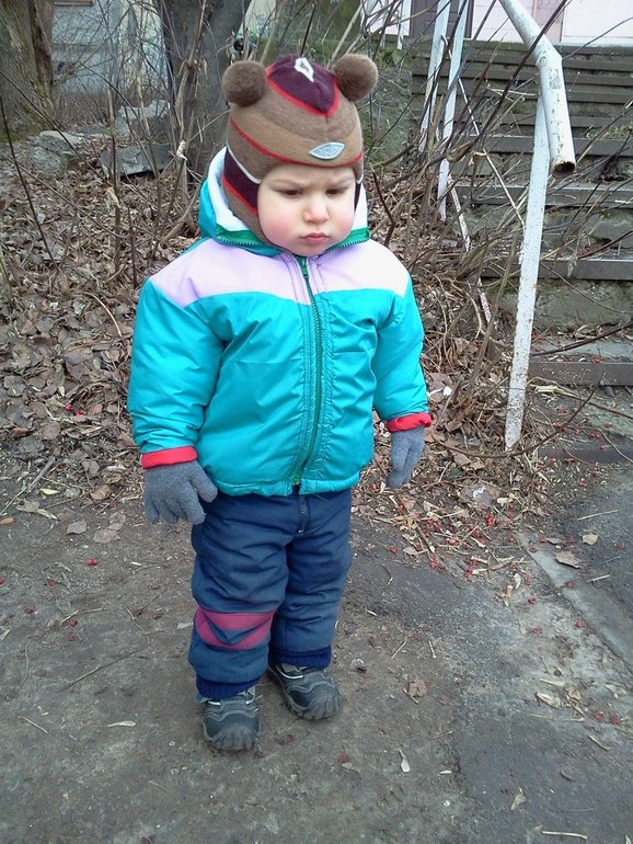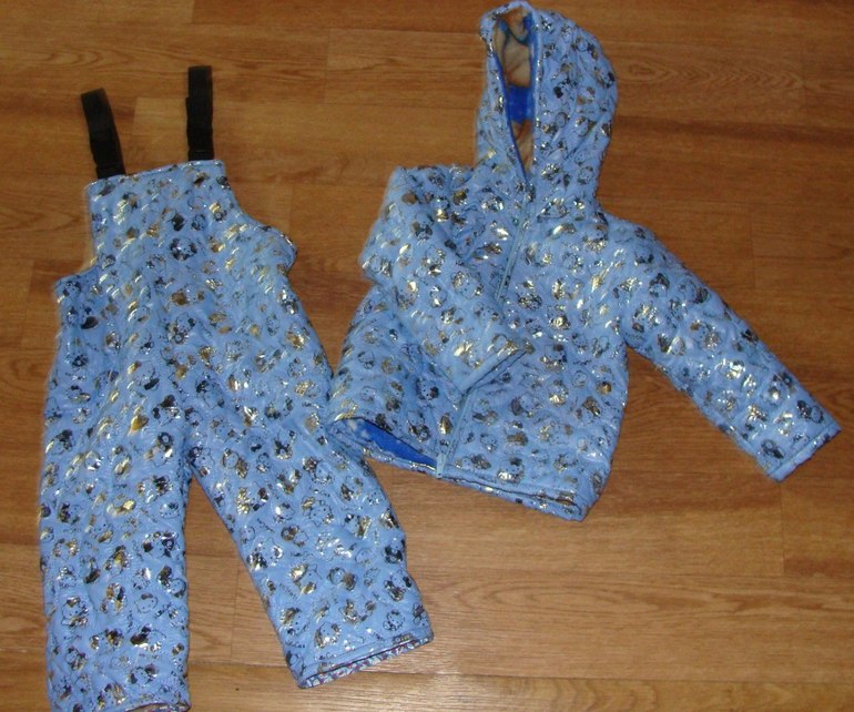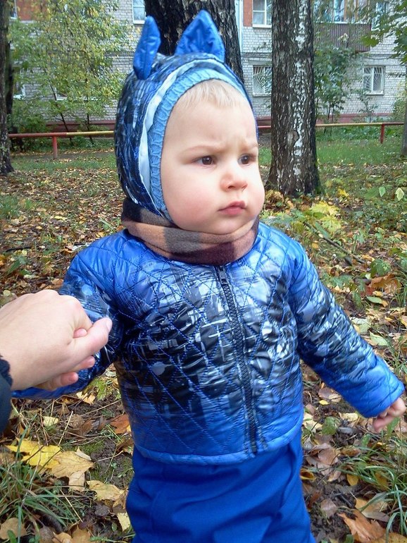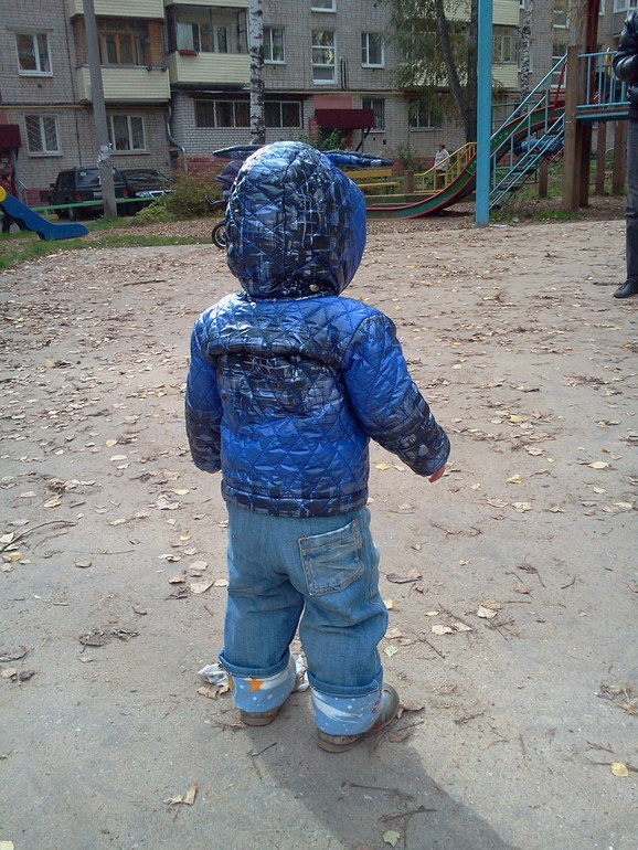 На ребенке комбинезон из взрослых джинс с подкладом из фланелевой пеленки. Куртка короткая, посадка не самая удачная, но он стойко отходил в ней всю осень. И была сшита ещё одна по той же выкройке.