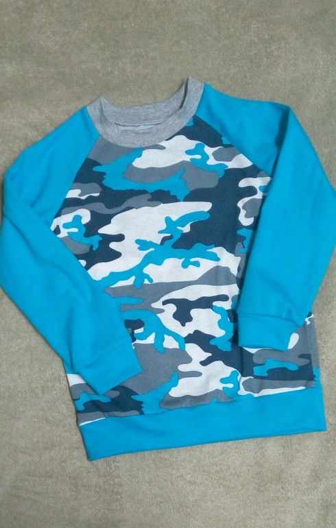 К мужскому празднику завезли в фикс Прайс множество футболок с разным камуфляжным принтом. Сначала хотела взять классическую расцветку, а потом разглядела голубую и уже в голове сложилась картинка. Майка самого большого 54 размера, свитшот получился 116 рр. Ещё хватит на шапку и снуд. Они в планах на весну.