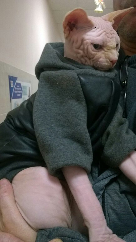 Животным без шерсти короткий широкий рукав трёт лапу на загибе с внутренней стороны ( очень нежная там кожа) в следующий раз или длиннее или сильно короче)