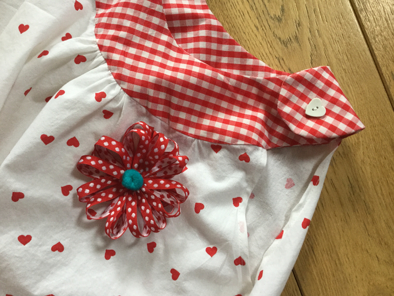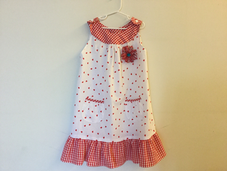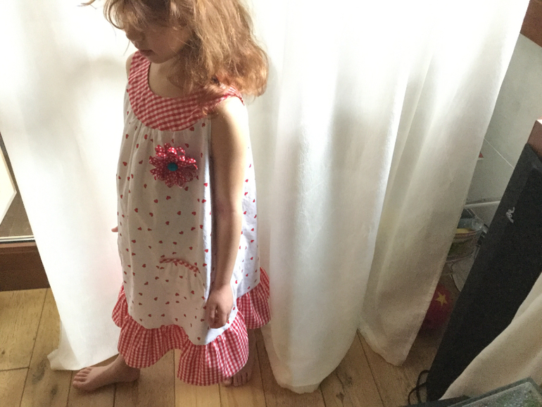 ассоциируется у меня со днем святого валентина)) очень нравится сочетание тканей и белого с красным в таком нежном варианте. И твоей доче идет, насколько ее можно увидеть. Молодец, хорошая работа!