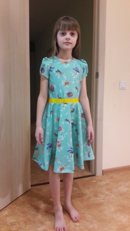 ткань ниагара,выкройка со шкатулки рр122. Дочка 128см 8,5лет,но стройная.поэтому в выкройке удлинила только верх платья на 4см.