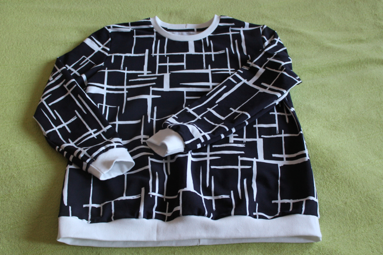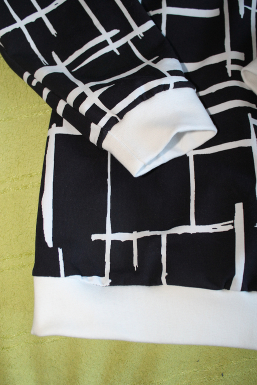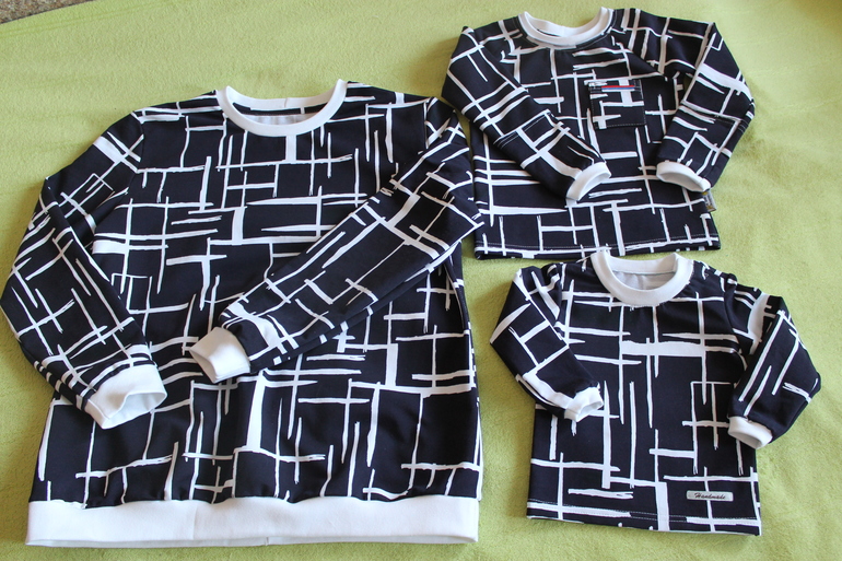Начну с фэмилилука мне и сыновьям. Вообще,изначально принт я покупала для мужа,но по факту он его забраковал. Решила,что сошью себе обновку. Хоть что-то себе я должна сшить? На деле мне очень понравилось,как на мне смотрится рисунок))) Выкройка с сайта Шкатулка,там водолазка,я ее расширила и удлиннила,горловину поменяла,добавила манжеты. Материал футер 2нитка с лайкрой,на отделке белая рибана. Вообще,хотела черную отделку,но материал оказался чернильно-синего цвета.