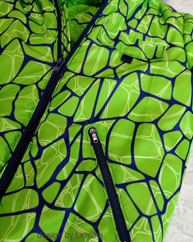 Долго думала что на подклад сделать, в местных магазинах не нашла флиса нужного оттенка, заказывать - не уверена что в тон подойдет. Еще и цвет такой, не салатовый, и не совсем зелень. Вобщем промучалась недельку в поисках и решила пришить флис на трикотажке, он толстоватый, поэтому куртка тепленькая получилась. Как только будет ближе к 0, так и оденем.
