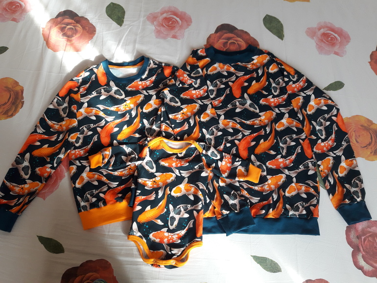 Шьем детямВот такой фемели лук пошился для трех сестр енок), размеры: 62 см, 146см и 44 размер.Ткань кулирка с лайкрой Карпы на синем, 1.25 м, плотность хорошая, для футболок слишком даже).Выкройки с сайта Шкатулка.