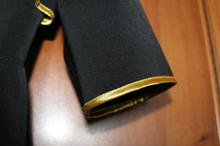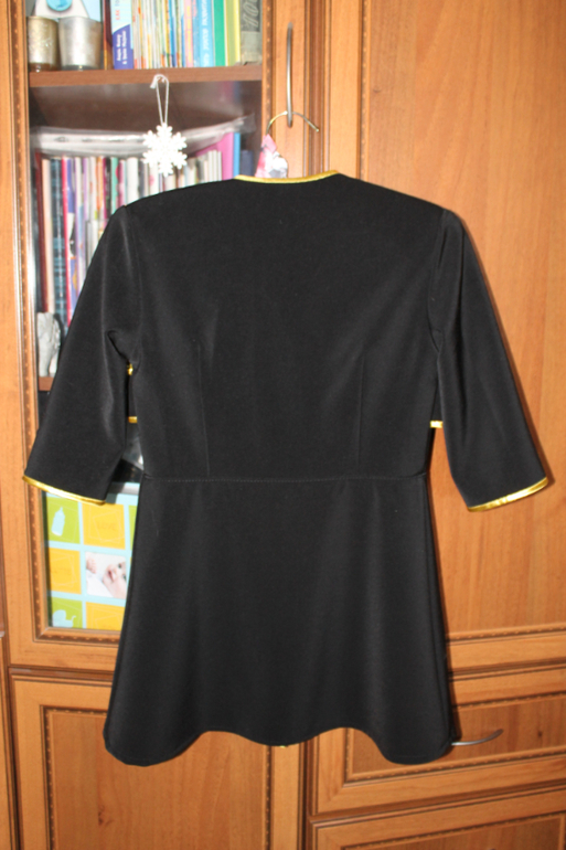 На какой размер изначальная вещь-не знаю. Я взяла за основу поварскую куртку из Оттобре 1/2013 м.17 на рост 122. Приталила,добавила "юбку". Сшито из неизвестной плотной костюмки. Изделие без подкладки,т.к.надо все срочняком...