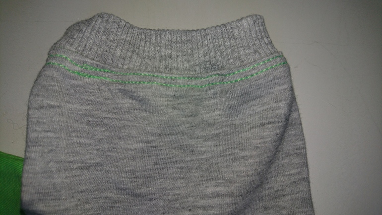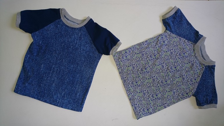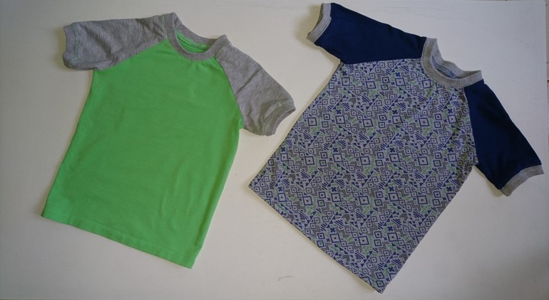 Когда мерила первую футболку, сын сказал, что длинная, как платье)) учла и на следующих длину уменьшила чуть-чуть, на 2 см вроде, не люблю когда спина открыта у деток, а они ж ползают, нагибаются, все задирается. Ещё на зелёной футболке кант рукавов отстрочила сверху плоским швом, вроде неплохо выглядит, но можно было и не делать этого.