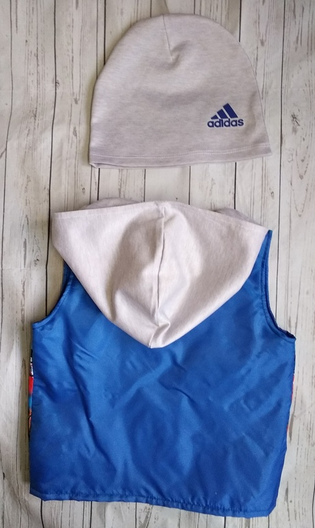 Капюшон у жилетки трикотажный, порезала майку, которую подружка отдала на перешив. Хватило ещё на шапочку.