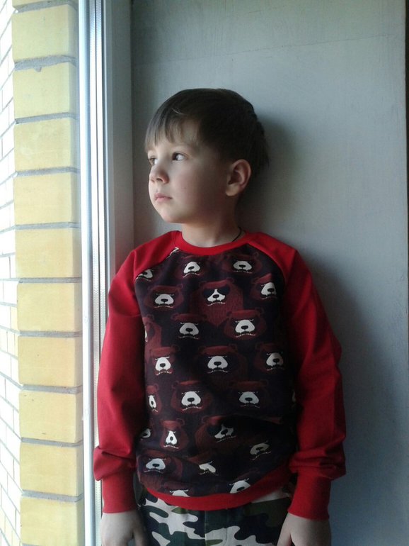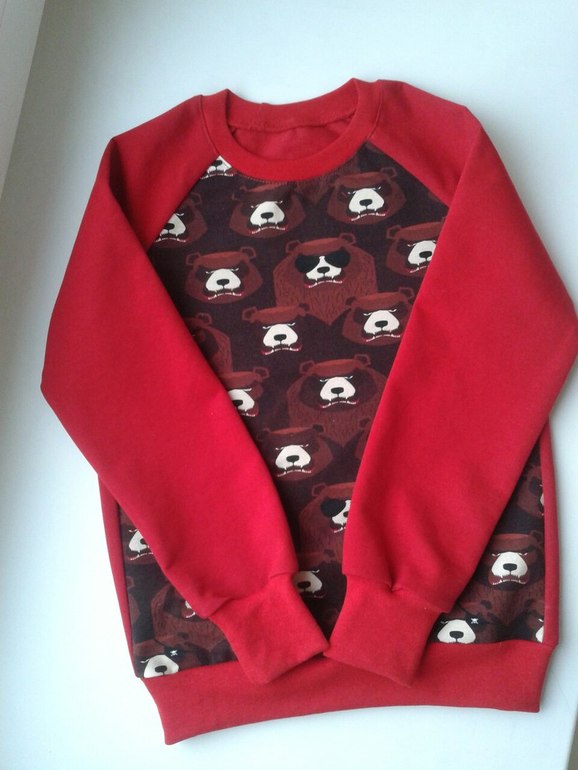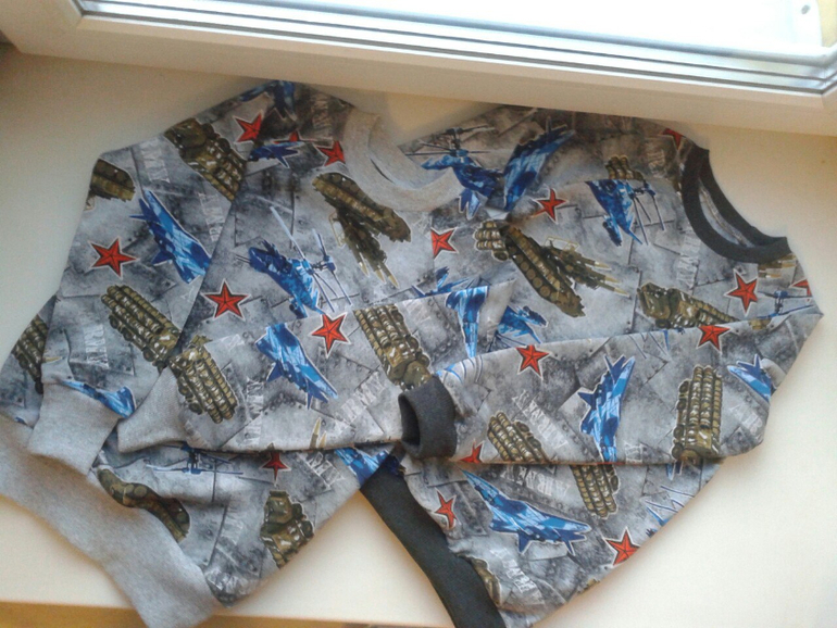 А это на 23 февраля шила, футер с начесом, очень понравился, чтоб в изделии не садился я отрез стираю 2-3 раза, и потом очень удобно, ворс на скатывается и принт стойкий. Можно конечно запас на усадку закладывать, 10%.