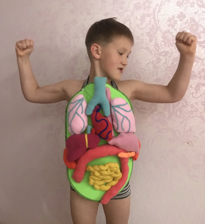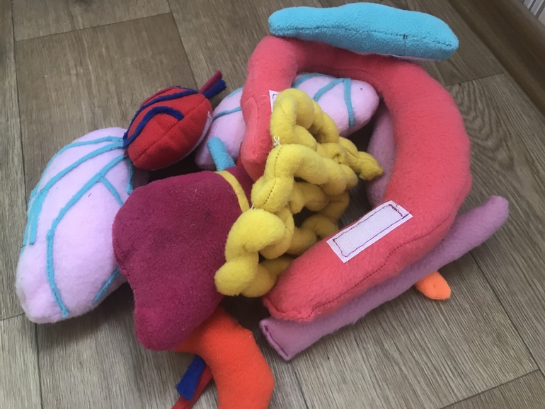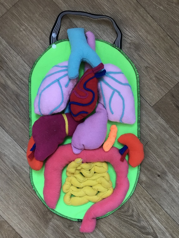 Все органы по рисункам из интернета кроились прямо на ткани. Пропорции не очень соблюдены, желудок вообще непонятный вышел.. Не спрашивайте где детородные органы)) мне этих хватило. Да и на подобных фартуках их не вилила, наверно в детском саду еще такое не проходят.))