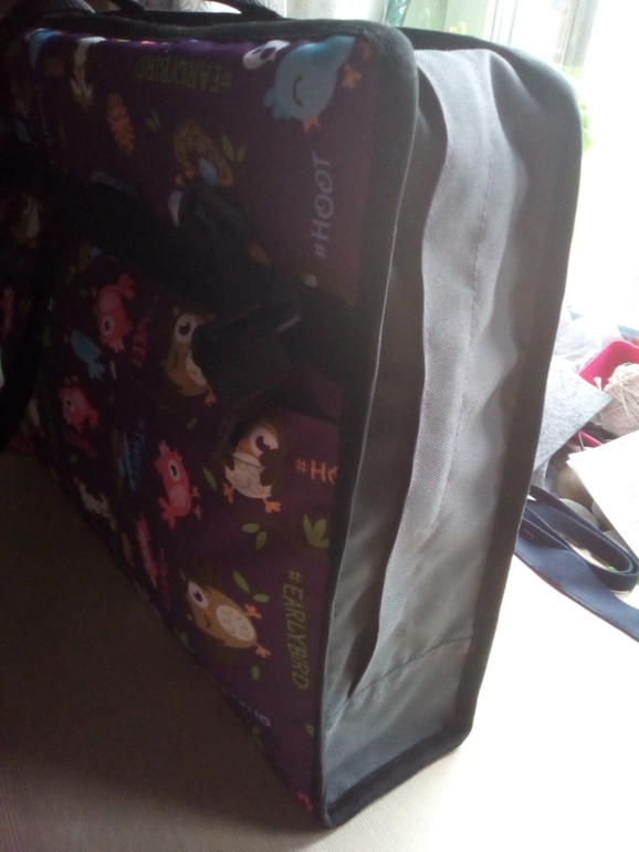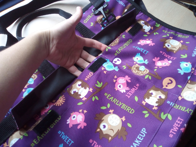 сумка формат А3, используемые материалы- оксфорд фиолет с совами, подклад, стропа, молнии, липучки, регуляторы, кусок пластика