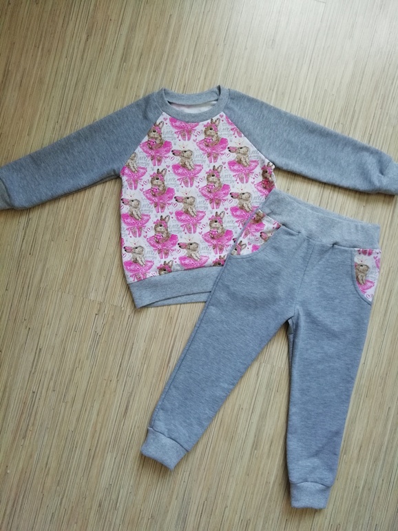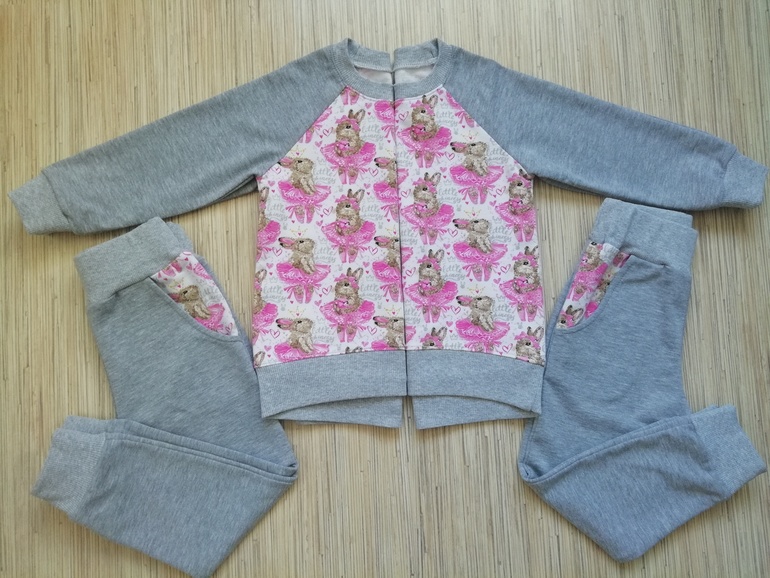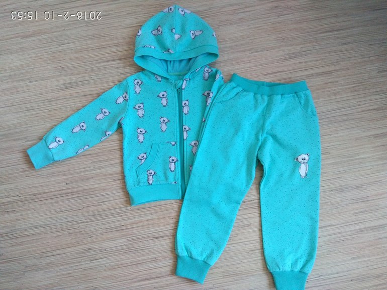 Наверное, пост надо было начать с этих костюмов, потому что ткань(футер 2нитка с начесом) на них была куплена ещё за полгода до покупки оверлока и это был первый трикотаж, который я купила. Точно знала, что хочу кофточки на молнии и штанишки к ним, но все осложнялось тем, что выкройки у меня не было и даже примерный расход ткани я не представляла, а ткань в магазине катастрофически заканчивалась. В итоге было куплено 0,75м принта, 0,75м компаньона и 20см рибаны в тон на 2комплекта с капюшоном. Пришла домой, постирала и от 0,75м осталось только 0,68м....Выкройку выбирала с учётом ткани, уместила. Кофточка по выкройке Оттобре 1-2011 м. 7 размер 92, изменила карманы, удлинила и немного подняла горловину спереди. Шов горловины закрыла киперной лентой, капюшон на подкладе. Штаны 98 размера по той же выкройке, что шила сыну 4-2013 м. 27 с карманами с отрезным бочком. На штаны рибаны не хватило. Сейчас активно носим эти костюмы, у них один минус, стирать надо после каждой прогулки.