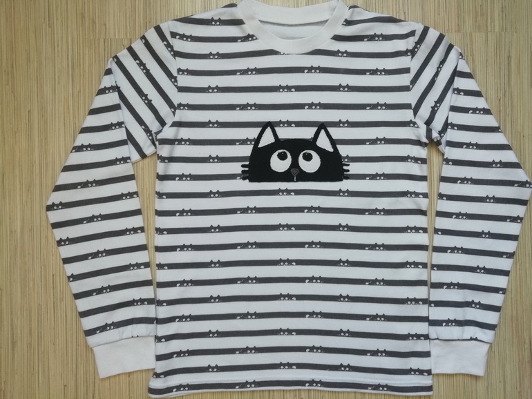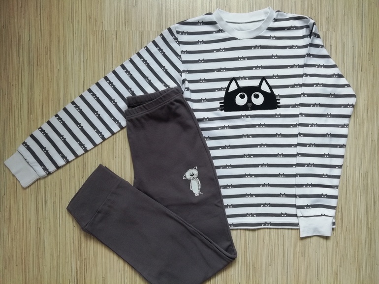Думаете на пижамах я остановилась? Нет! Я сшила ещё три! Дочкам из футера с начесом(их тоже не фотографировала, там нет ничего интересного) , а сыну из интерлока(он большой любитель не только пингвинов, но и кошек).