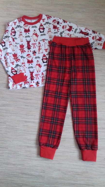 Следующим "проектом" была пижама сыну, он любит спать в пижаме, привык и снимать не хочет, а из всех своих пижам активно вырос. Ткань интерлок выбирали вместе любимый красный цвет и пингвины все в одной пижаме.
