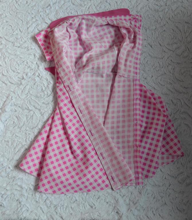 По длине ЭТО как платье Аннушке - по колено. Но ввиду дефицита ткани получилось узким. Я поставила кнопочки сначала не до низа. Потом дополнила еще 2 ниже.